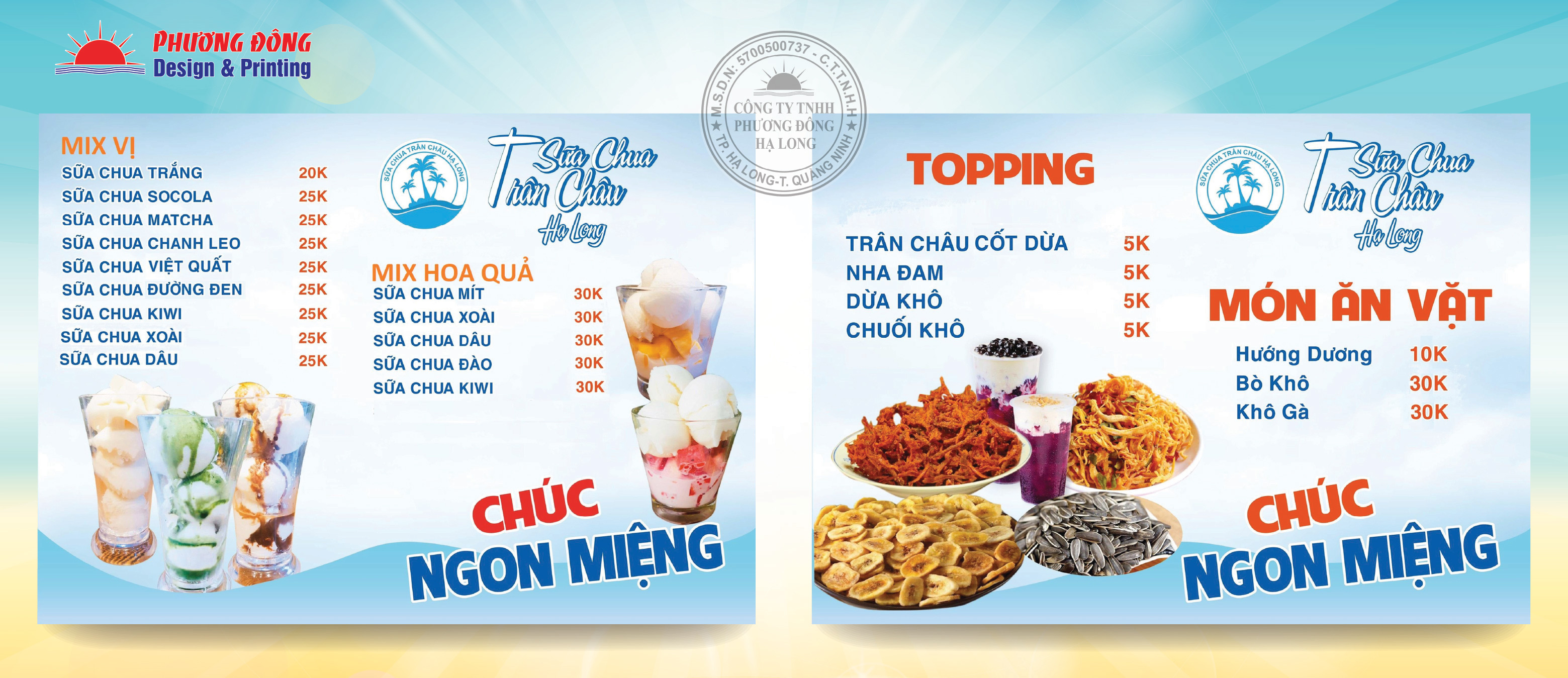 Tại công ty in Phương Đông Hạ Long thiết kế và in ấn những loại menu: thiết kế in ấn menu trà sữa, thiết kế in ấn menu quán cafe, thiết kế in ấn menu nhà hàng, thiết kế in ấn menu spa, thiết kế in ấn menu quán ăn vặt, thiết kế in ấn menu quán nhậu, thiết kế in ấn menu đồ ăn ...